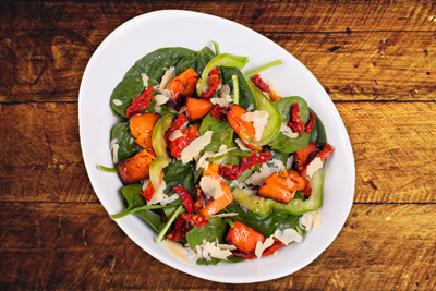 Potatoroasted potatoes, roasted capsicum, kalamata olives, haloumi, fresh herbs, garnished with rocket on a pumpkin base