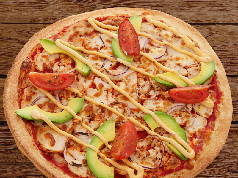 Fiesta Peri-Perichicken breast fillet, roma tomatoes, spanish onions, avocado, topped with peri peri sauce on a tomato base