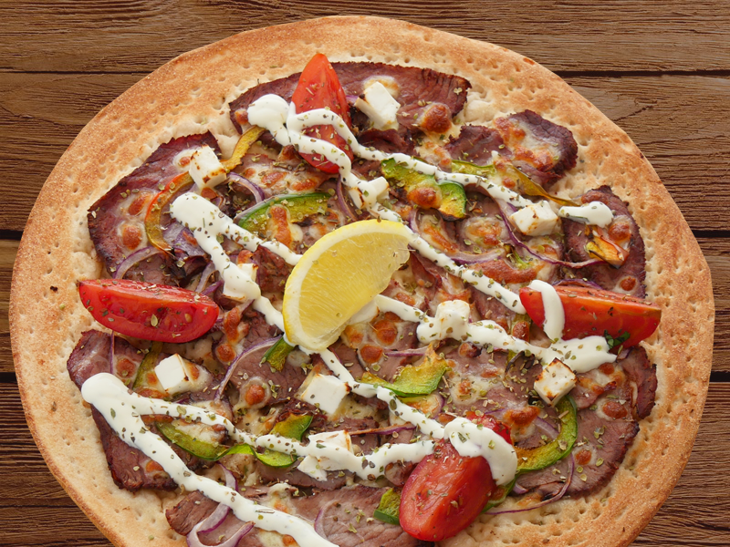 Mediterranean Lambroast lamb, fresh capsicum, spanish onions, roma tomatoes, feta, oregano, topped with tzatziki yoghurt & a wedge of lemon on a garlic & olive oil base