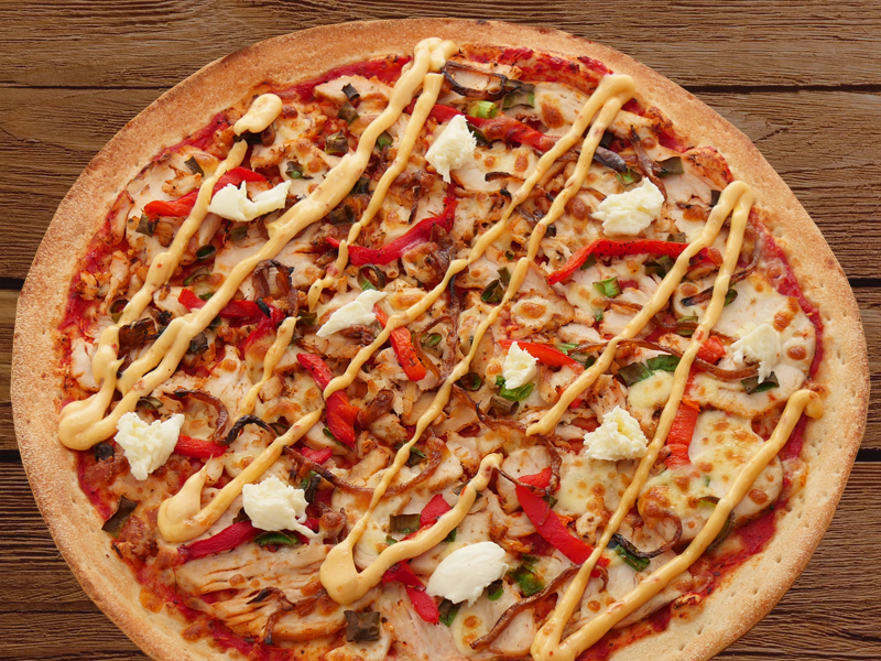 BBQ Meat Loverspepperoni, smoked ham, chicken breast, ground beef, bacon on a bbq base