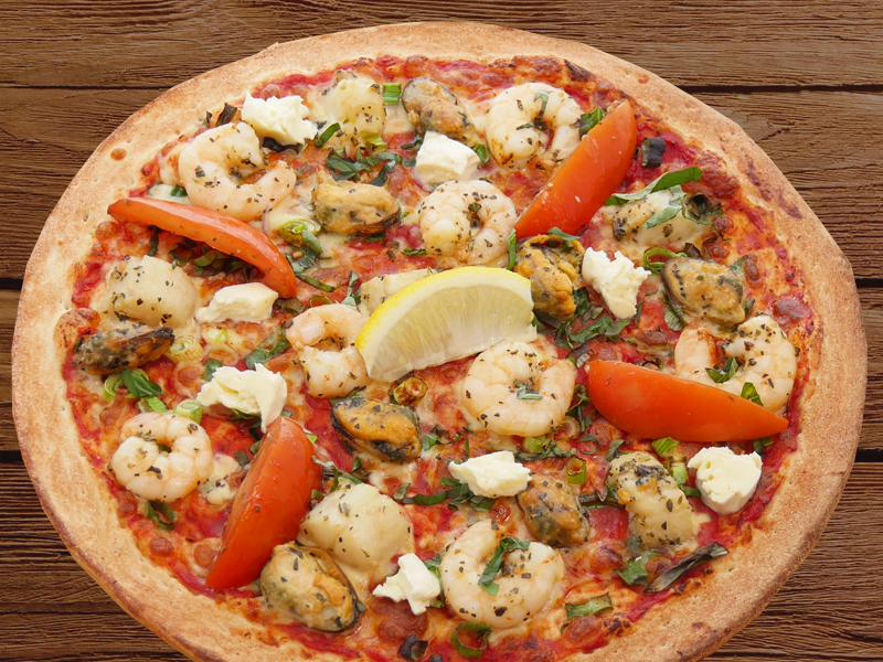 Szechuan ChickenSpicy szechaun chicken breast, roasted capsicum, spanish onion, jalapeños, topped with peri-peri sauce on a tomato baseSeafood Pizzas