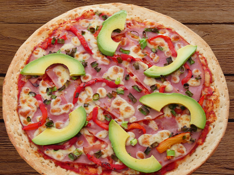 Avocadosmoked ham, fresh avocado, roasted capsicum, shallots, brie on a tomato base