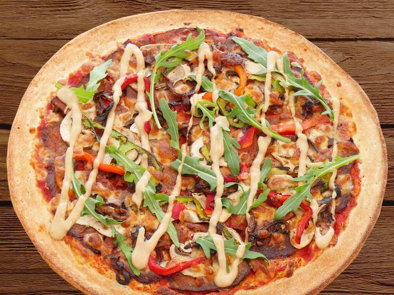 Steakhousetender roast beef, roasted capsicum, fresh capsicum, caramelised onions, mushrooms, topped with wild rocket & prego sauce on a tomato base