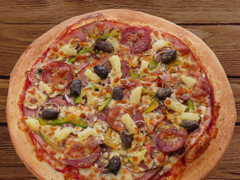 Supremepepperoni, smoked ham, fresh capsicum, spanish onions, mushrooms, pineapple, kalamata olives on a tomato base