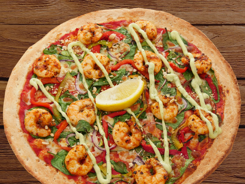 Szechuan Prawnchilli szechuan seasoned prawn, baby spinach, spanish onion, roasted capsicum, fresh capsicum, garnished with crushed cashews, pesto sauce & a wedge of lemon on a tomato base