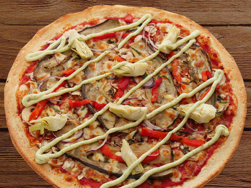 Vegetarian Supremeartichokes, grilled eggplant, roasted capsicum, sundried tomatoes, mushrooms, spanish onions, topped with pesto aioli on a tomato base