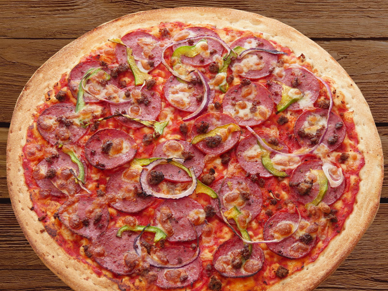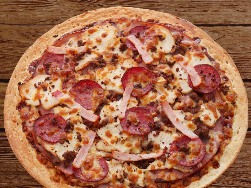 Supremepepperoni, smoked ham, fresh capsicum, spanish onions, mushrooms, pineapple, kalamata olives on a tomato base