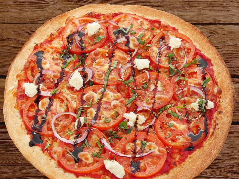 Bruschetta Pizzafresh tomatoes, spanish onions, bocconcini, garnished with fresh basil and a drizzle of balsamic vinegar on a tomato baseBeverages