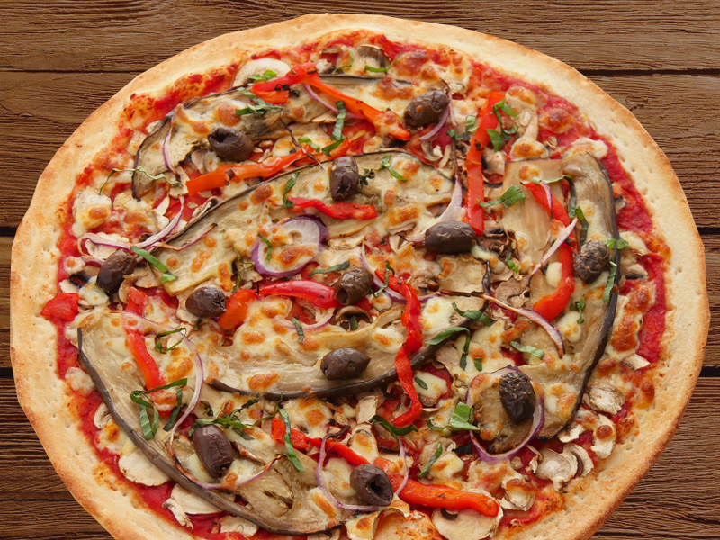 Chargrilled Eggplantchargrilled eggplant, mushrooms, spanish onions, roasted capsicum, kalamata olives & brie topped with fresh herbs on a tomato base