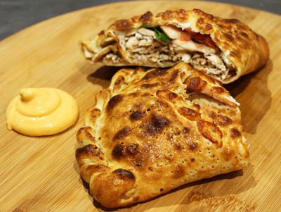 Chicken Calzone$12.00Chicken breast fillet, shallots, mushrooms, roasted tomatoes, feta on a bbq base