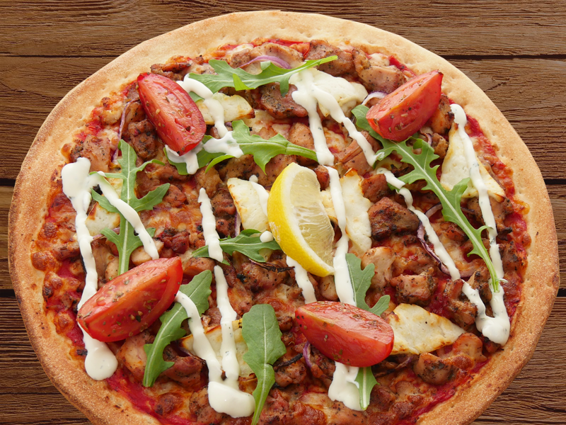 Mediterranean Lambroast lamb, fresh capsicum, spanish onions, roma tomatoes, feta, oregano, topped with tzatziki yoghurt & a wedge of lemon on a garlic & olive oil base